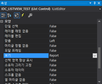 그리드 형식으로 표시하길 원하기 때문에 리스트 컨트롤의 속성에서 리포트 방식으로 변경합니다.