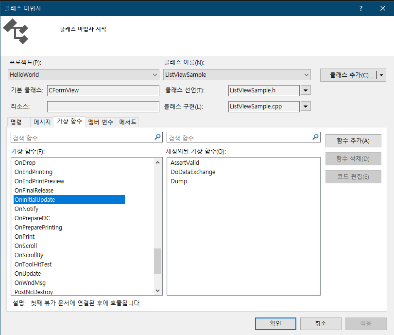 CTRL + SHIFT + X 단축키를 눌러 클래스 위자드를 실행 한 후 가상함수 탭에서 OnInitialUpdate 함수를 찾아 추가해 줍니다.