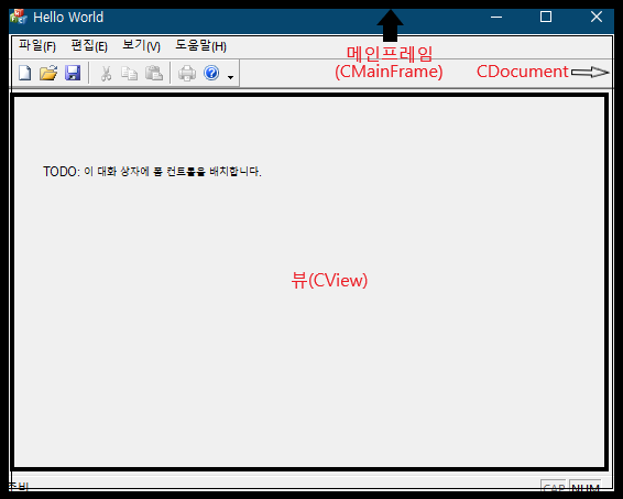 프레임 윈도우가 하는 역활은 툴바, 스테이터스바, 메뉴, 뷰 등과 같이 메시지가 발생할때 처리하는 역활을 합니다.