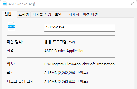 ASDSvc.exe 파일 속성을 찾아보니 다음 서비스(SafeTransactionSVC)와 연관되어 있는 것을 알 수 있습니다.