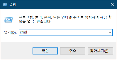 다음과 같은 창이 실행되면 "cmd" 명령을 입력한 후 확인 버튼을 누릅니다.