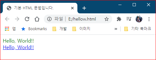 위 결과와 같이 HTML에서는 태그에 정해진 속성을 이용하여 색상, 크기, 링크등 많은 기능을 쉽게 변경가능합니다.