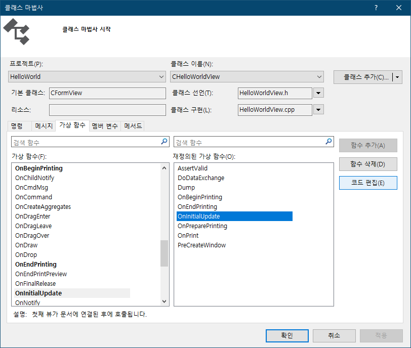 가상 함수 탭에서 OnInitializeUpdate 함수를 선택하시고 코드 편집을 누릅니다.